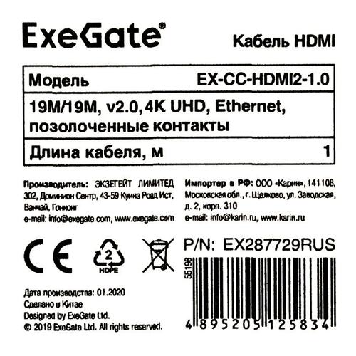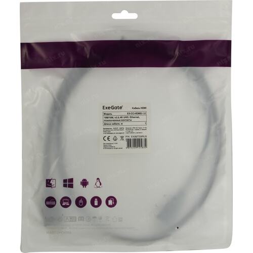 Кабели Exegate EX287729RUS Кабель HDMI ExeGate EX-CC-HDMI2-1.0 (19M/19M, v2.0, 1м, 4K UHD, Ethernet, позолоченные контакты) | НИКС Екатеринбург