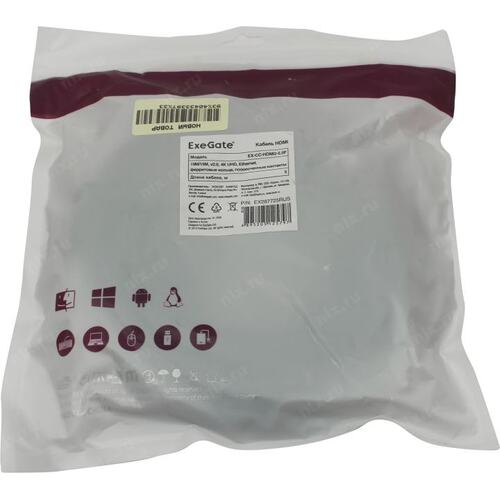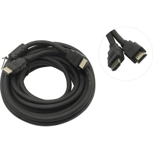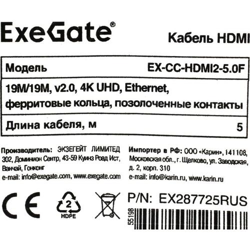 Кабели Exegate EX287725RUS Кабель HDMI ExeGate EX-CC-HDMI2-5.0F (19M/19M, v2.0, 5м, 4K UHD, Ethernet, ферритовые кольца, позолоченные контакты)