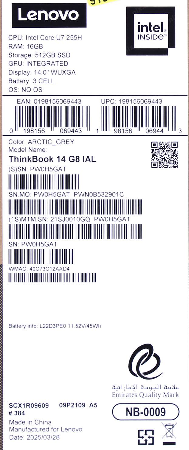 Ноутбук Lenovo ThinkBook 14 G8 U7-255H/ 16Gb/ 512Gb/ DOS 21SJ0010GQ