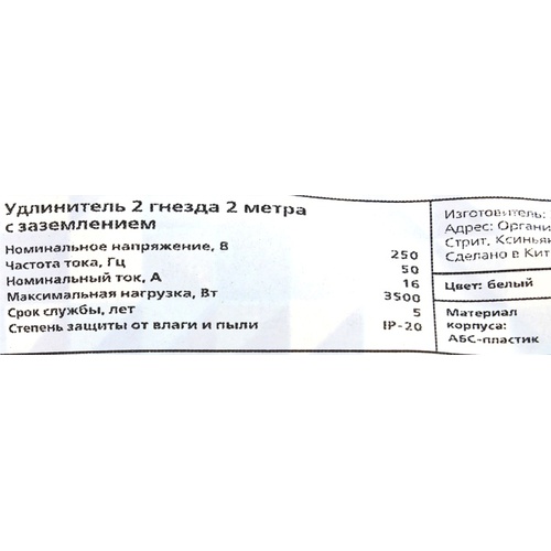 W 5м (2 розетки) белый (пакет ПЭ) (продается кратно 10 шт.)