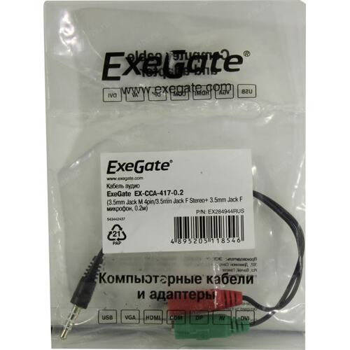 Кабели Exegate EX284944RUS Кабель аудио ExeGate ExeGate EX-CCA-417-0.2 (3.5mm Jack M 4pin/3.5mm Jack F Stereo+ 3.5mm Jack F микрофон, 0,2м)