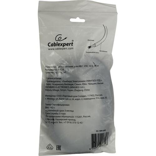 Кабель питания сист.блок-монитор Cablexpert PC-189-VDE, 1.8м, C13-C14, VDE, 10А, Сечение провода: 0,75 мм2, черный, с заземлением (100) (023757)