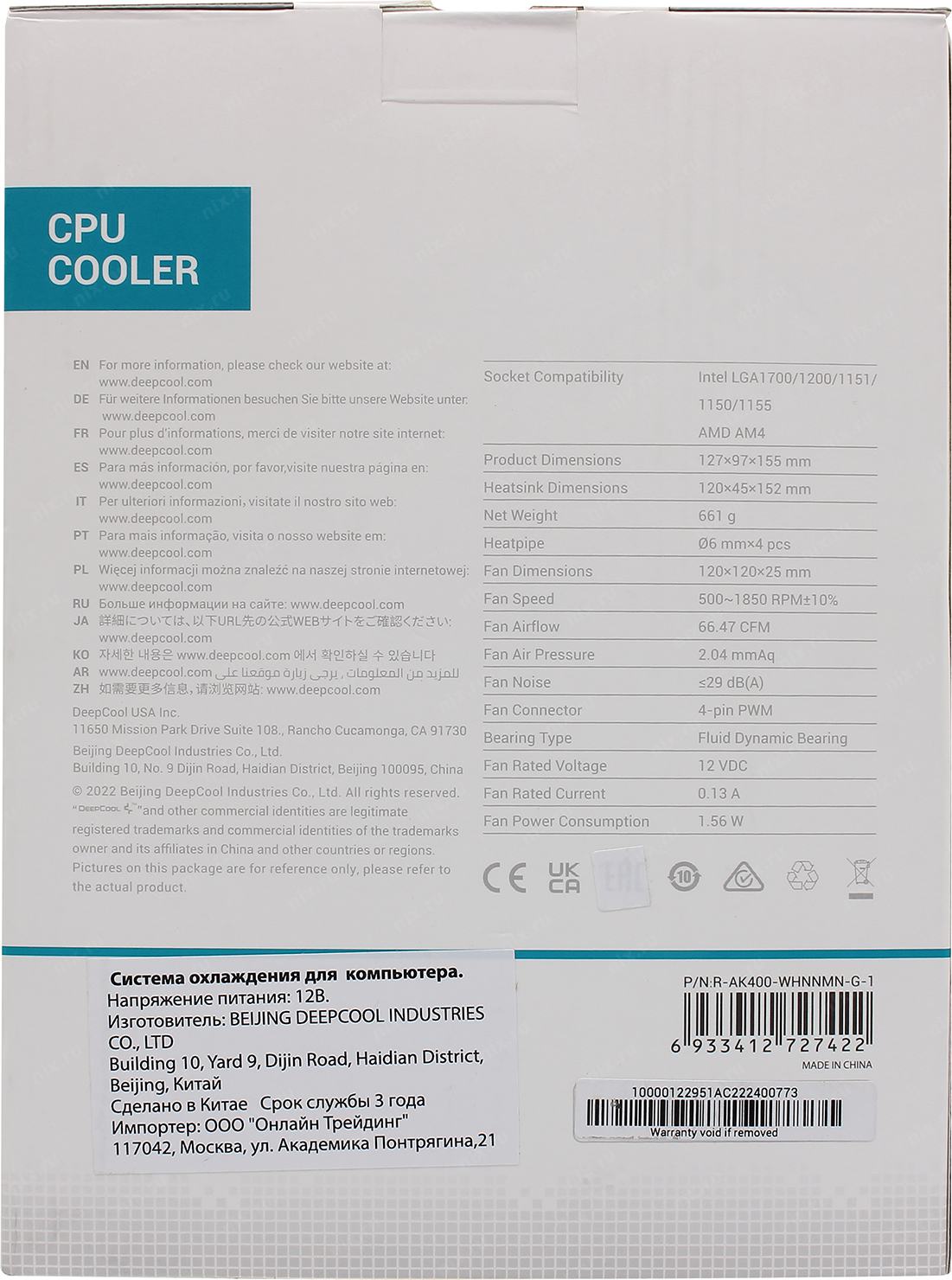 Вентилятор Deepcool AK400 WH (White, Height 155mm, 6mm x 4pcs, Fan 120mm, 500;1850RPM ±10%, < 29 dB(A), 4-pin PWM, TDP 220W, Al+Cu, Screw, Socket AMD AM5/AM4, Intel LGA1700/1200/115x) (R-AK400-WHNNMN-G-1) (18) (727422)