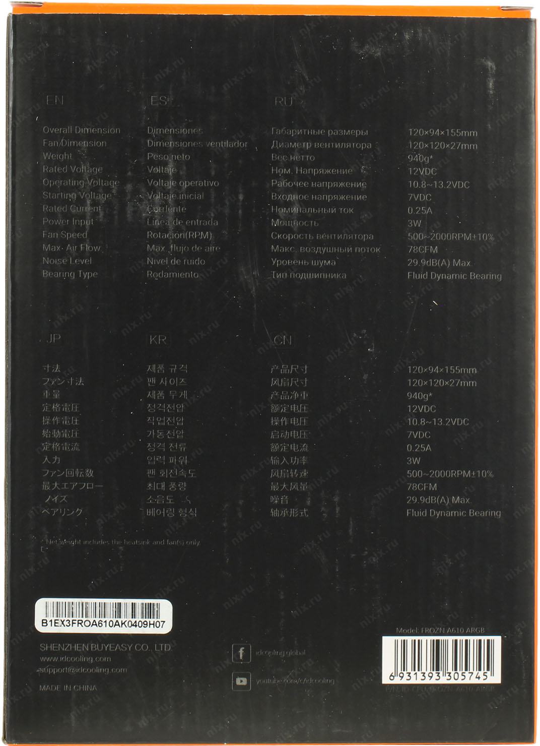 Вентилятор Cooler ID-Cooling FROZN A610 ARGB (LGA20XX/1700/1200/115X/AM5/AM4 TDP 260W, PWM, черный, 6 тепл.трубок + медная база, FAN 120mm)) RET [FROZNA610ARGB]