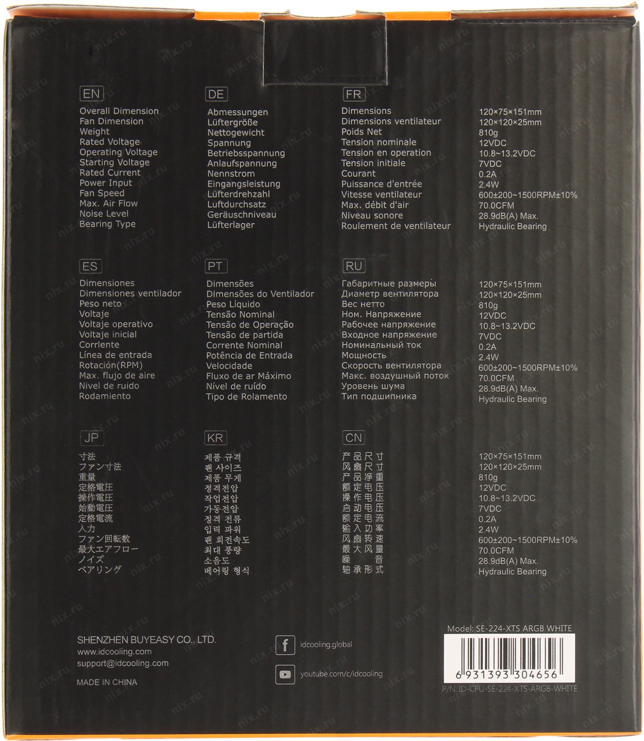 Кулер для процессора ID-COOLING SE-224-XTS ARGB WHITE LGA1700/1200/115X/AM5/AM4 (10шт/кор, TDP 220W, PWM, 4 тепл.трубки прямого контакта, ARGB FAN 120mm, белый) RET