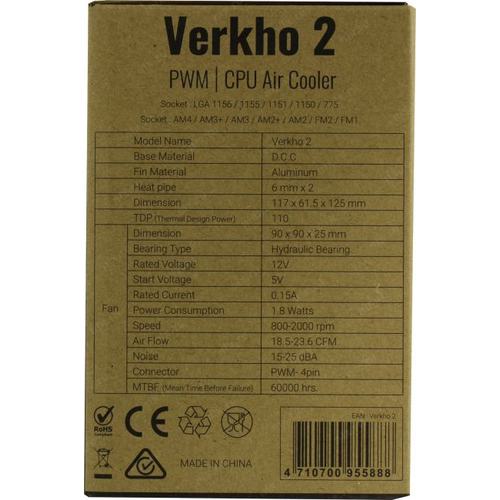 Кулер для процессора Formula V Line Verkho 2, 90mm FAN, 2 HEAT PIPES, 4-PIN PWM, 800-2000 RPM, 15-25DBA, HYDRO BEARING, LGA1700/1200/115x/775, AM5/AM4/AM3+/AM3/AM2+/AM2/FM2/FM1