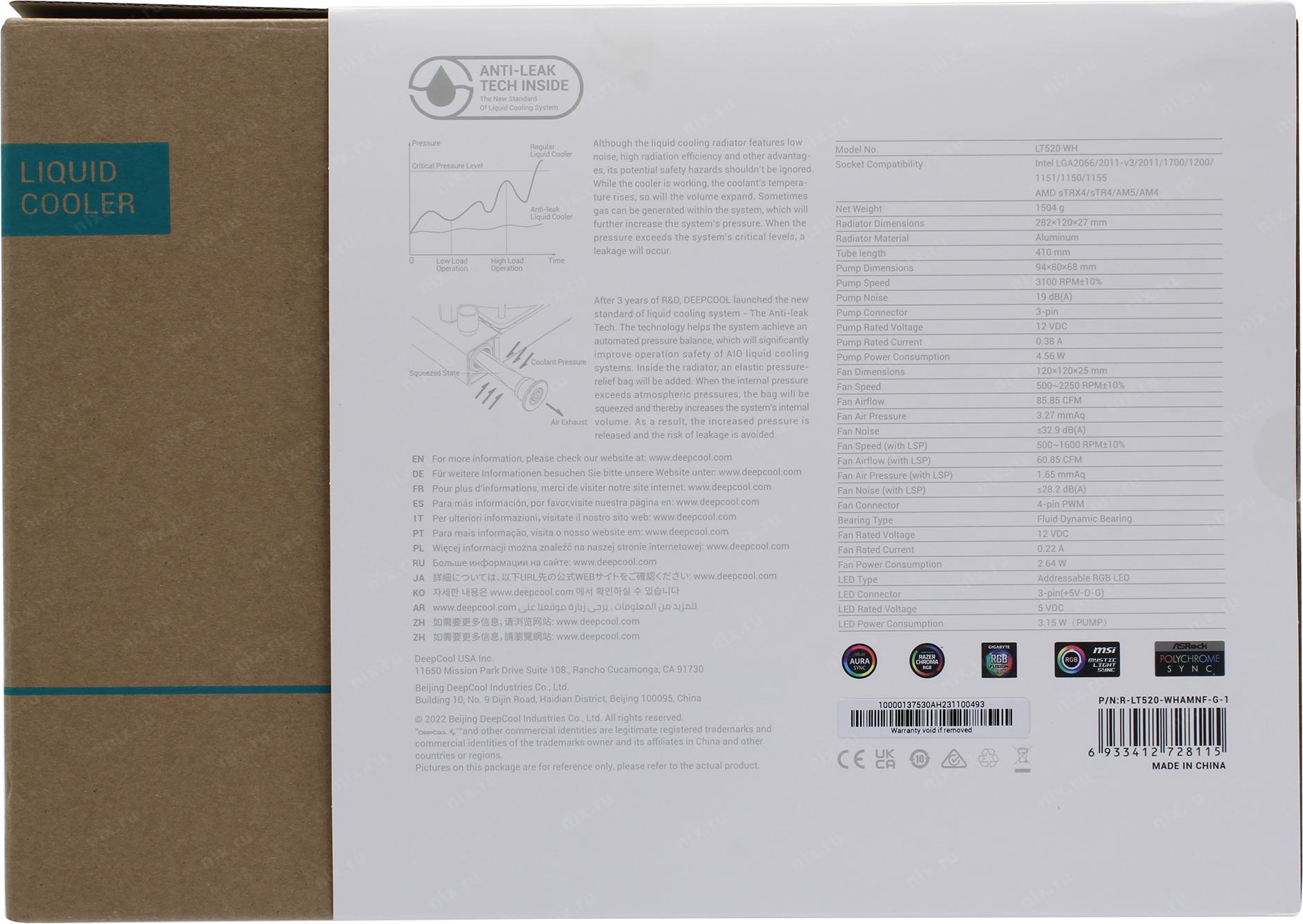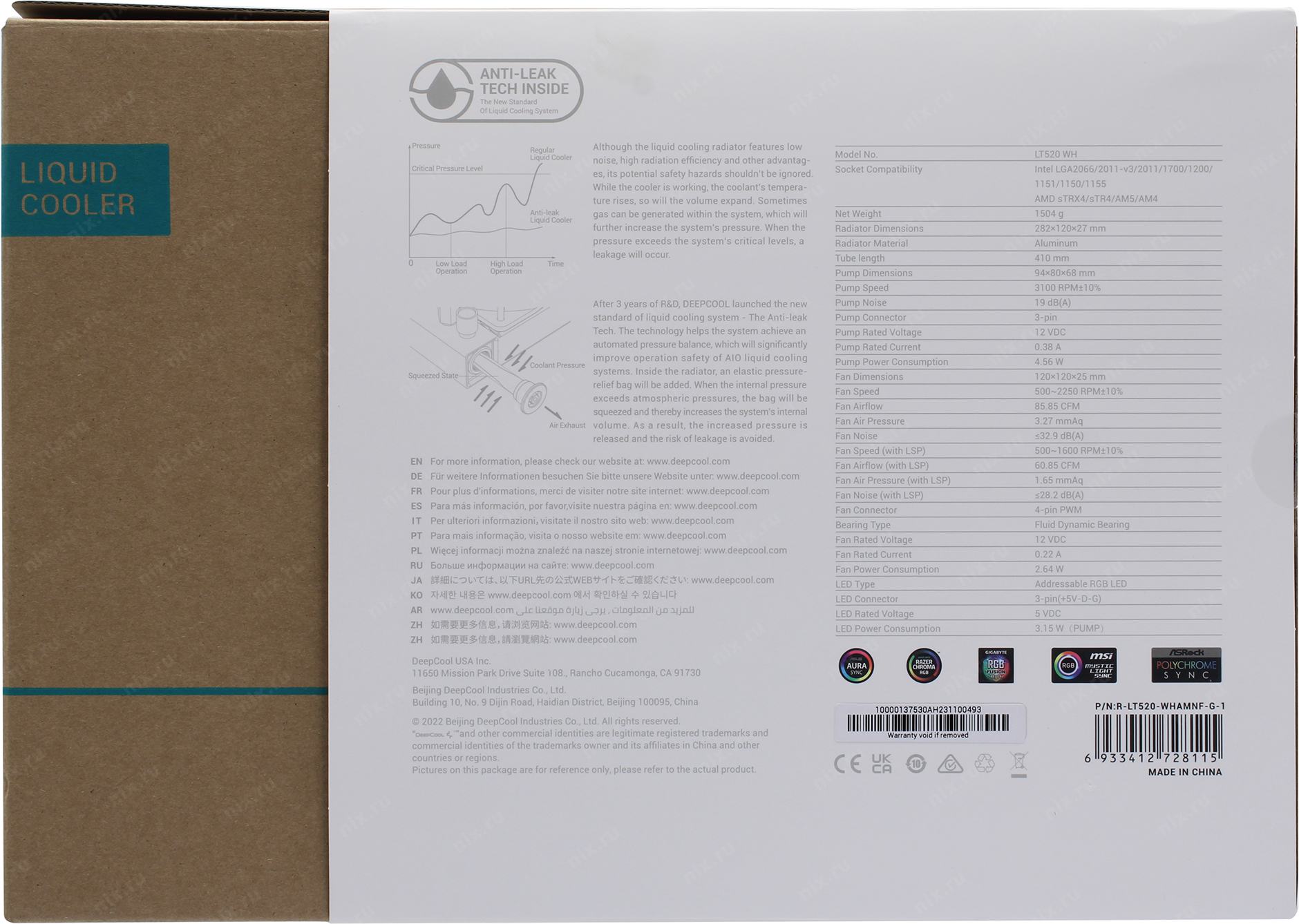 Система водяного охлаждения Deepcool LT520 ARGB Soc-AM5/AM4/1200/1700/1851 белый 4-pin 28.2-32.9dB Al 280W 1504gr Ret (R-LT520-WHAMNF-G-1)