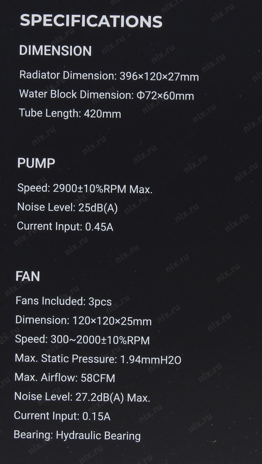 120 x 27 x 396 мм (только радиатор), 72 х 60 х 72 мм (водоблок)