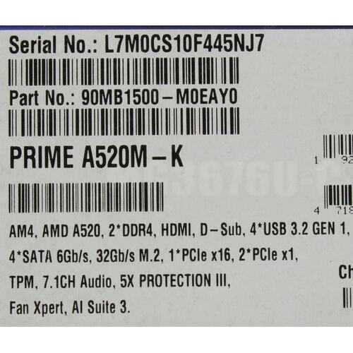 Материнская плата ASUS PRIME A520M-K (Socket AM4, mATX, 2xDDR4(64GB), VGA/HDMI 2.1, 1xPCIe 3.0x16/2xPCIe 3.0, 1xLAN, 4xSATA 6Gb/s, 1xM.2, 4xUSB 3.2, 2xUSB 2.0, 1xPS/2) [PRIMEA520M-K]