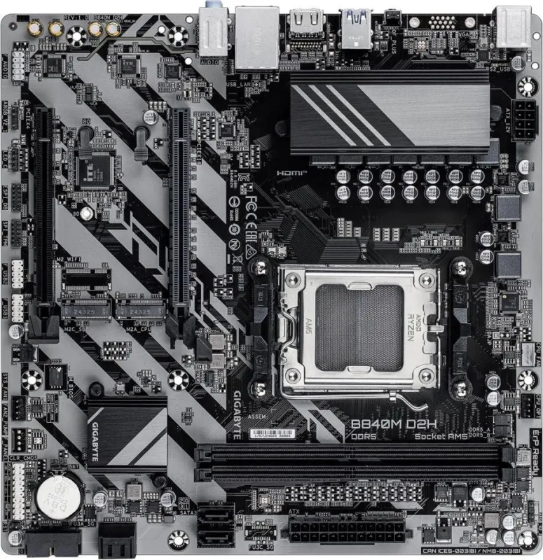 Материнская плата Gigabyte B840M D2H (Socket AM5, AMD B840, 2xDDR5-5200, HDMI, 2xPCI-Ex16, 4xSATA3(RAID 0/1/10), 2xM.2, 8 Ch Audio, 1x2,5GLan, (4+4)xUSB2.0, (2+2)xUSB3.2, 1xPS/2, mATX) RTL [B840MD2H]