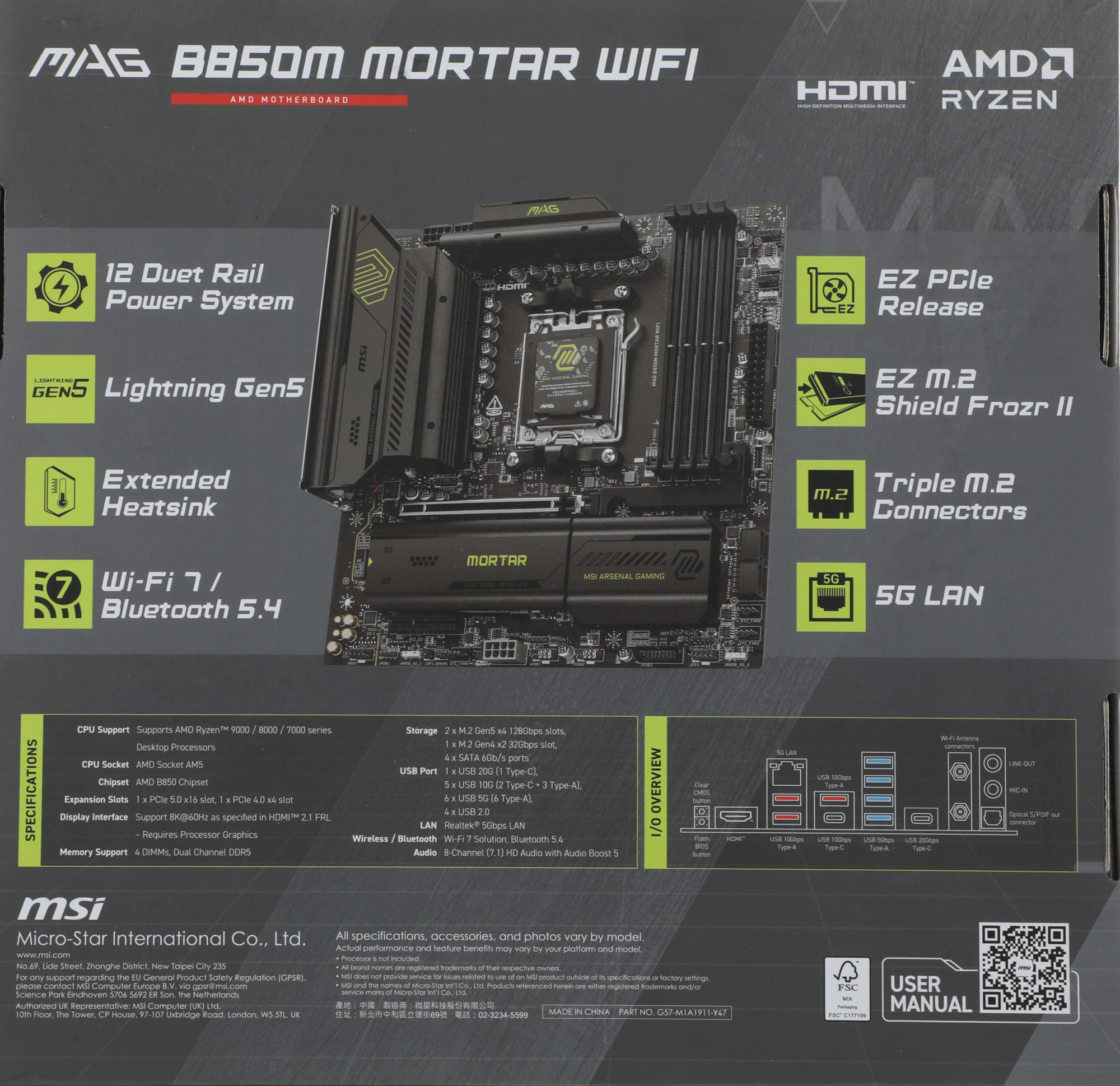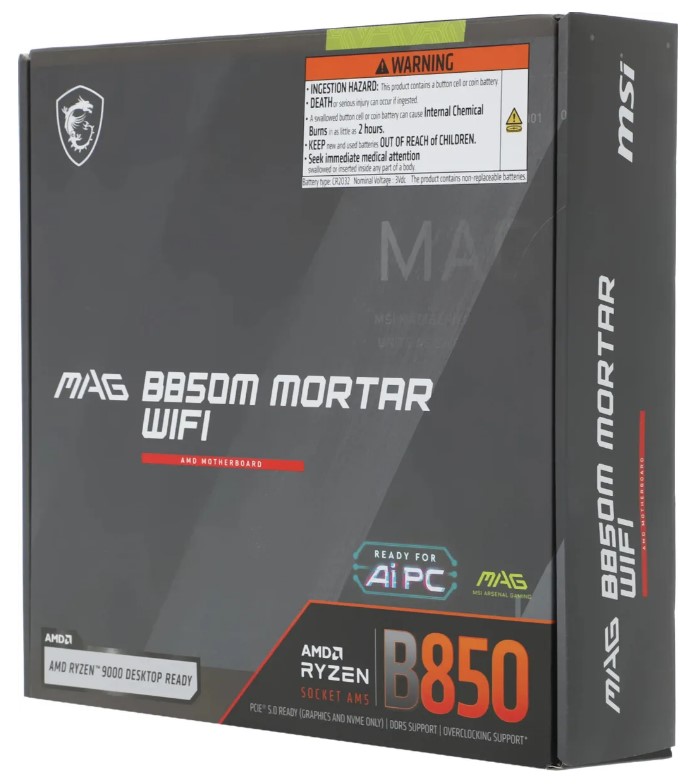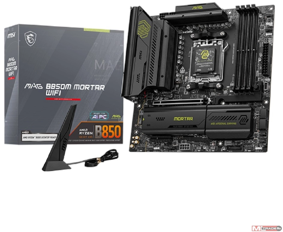 Материнская плата MSI MAG B850M MORTAR WIFI B850, AM5, 4*DDR5, 1*PCIEx16, 1*PCIEx4, 3*M.2, 3*TypeC, 3*USB3.2Gen2, 6*USB3.2Gen1, 4*USB2.0, 4*SATA3.0, 5G, HDMI, M-ATX, RTL
