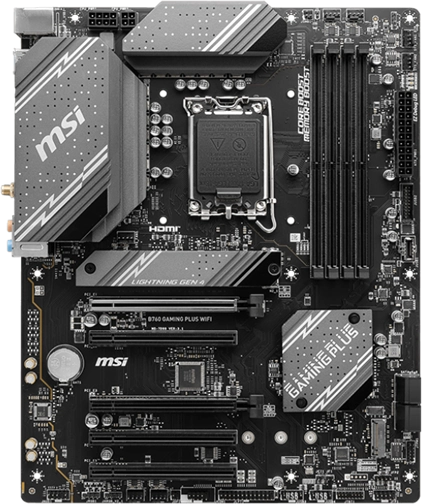 Материнская плата MSI B760 GAMING PLUS WIFI B760, LGA1700, 4*DDR5, 5*PCIEx16, 2*M.2, 2*TypeC, 2*USB3.2Gen2, 2*USB3.2Gen1, 8*USB2.0, 4*SATA3.0, 2.5G, DP, HDMI, ATX, RTL