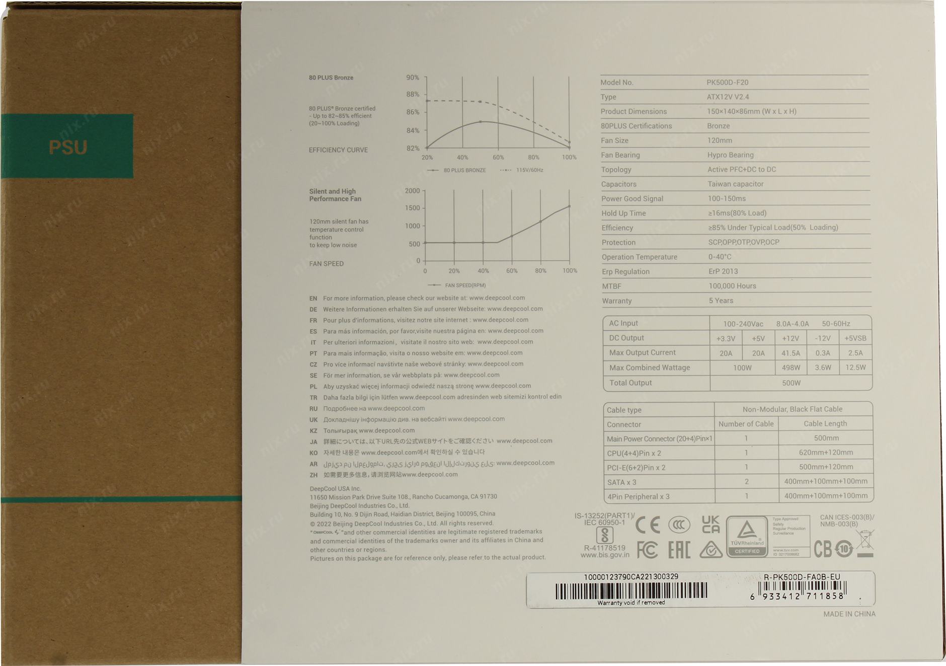 Блок питания Deepcool ATX 500W PK500D 80+ bronze (20+4pin) APFC 120mm fan 6xSATA RTL R-PK500D-FA0B-EU