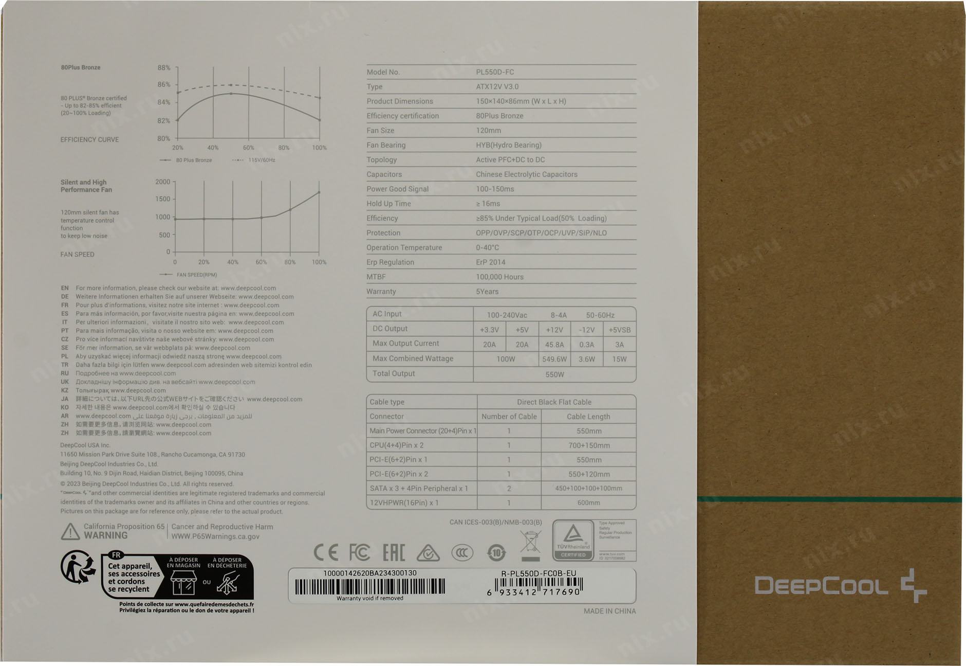 Блок питания Deepcool PL550D (ATX 3.0, 550W, PWM 120mm fan, Active PFC+DC to DC, 80+ BRONZE) RET (R-PL550D-FC0B-WDEU-V2)