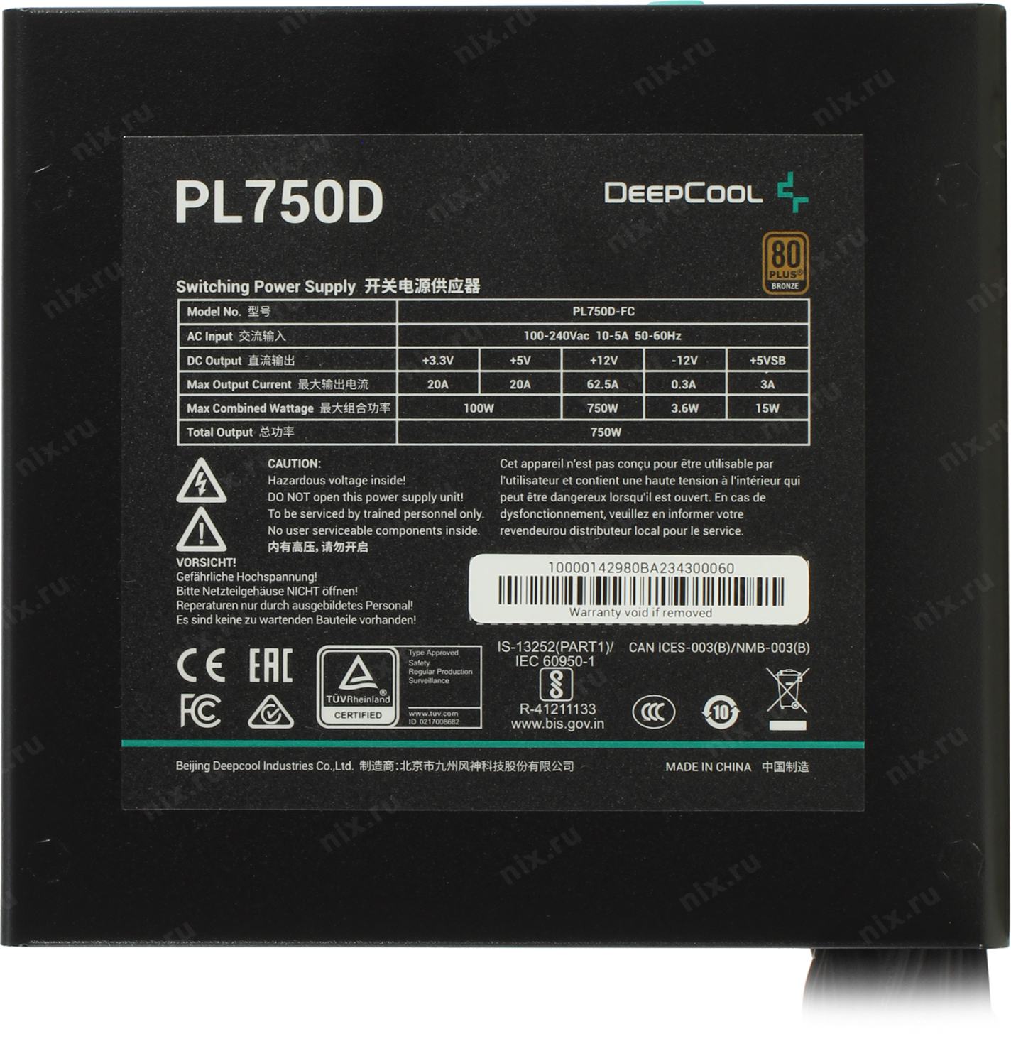 Блок питания Deepcool PL750D (ATX 3.0, 750W, PWM 120mm fan, Active PFC+DC to DC, 80+ BRONZE) RET (R-PL750D-FC0B-WDEU-V2)
