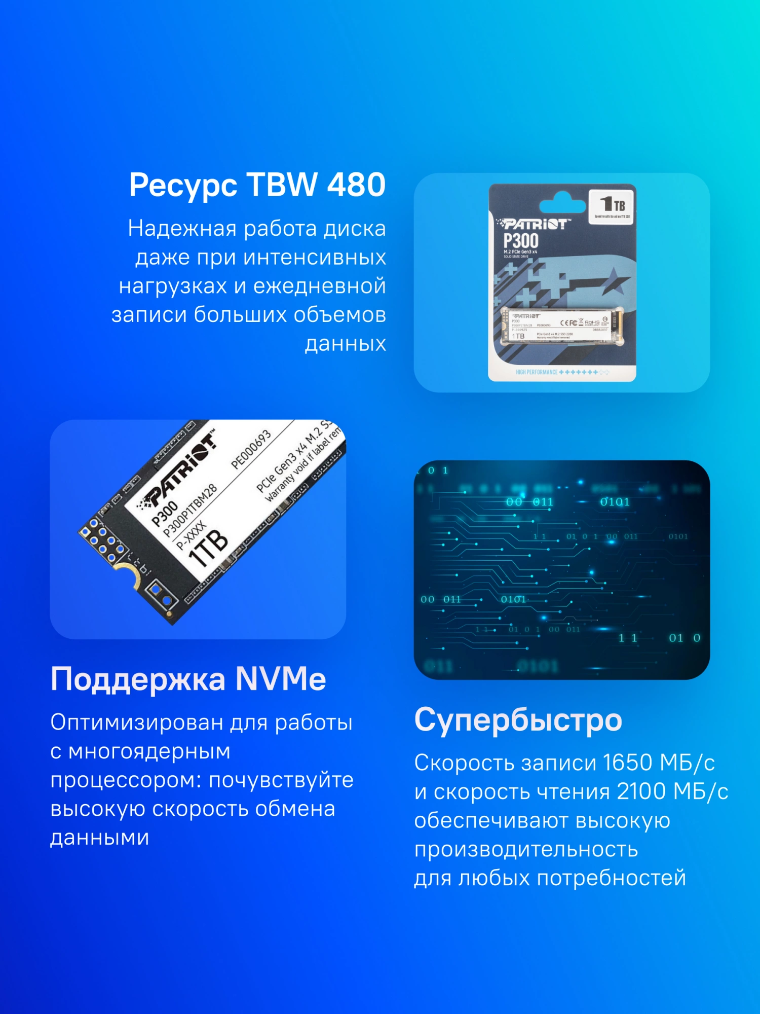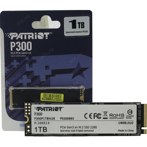Твердотельный накопитель Patriot P300 P300P1TBM28 SSD, M.2, 1.0Tb, PCI-Ex4, чтение: 2100 Мб/сек, запись: 1650 Мб/сек, QLC 3D, NVMe, TRIM