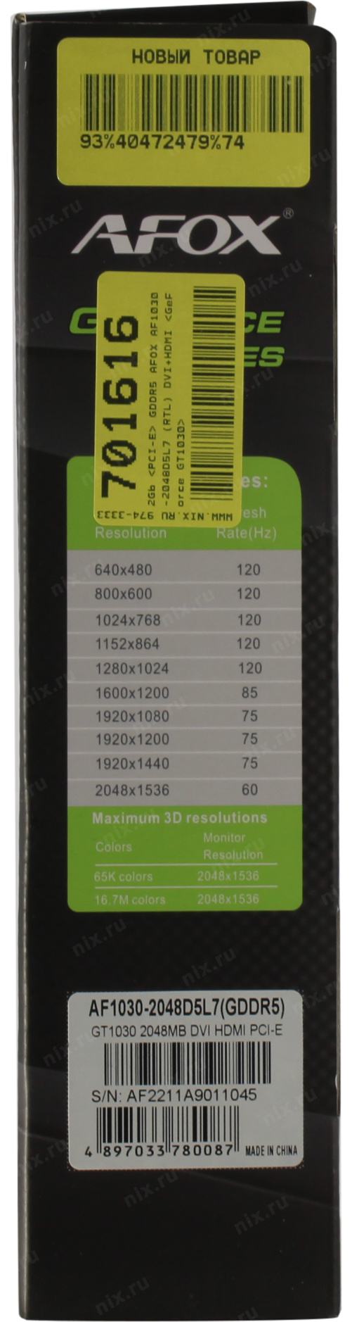 Видеокарта Afox GT1030 2GB GDDR5 64bit DVI HDMI 1FAN LP RTL (780087) (GeForce GT 1030) AF1030-2048D5L7