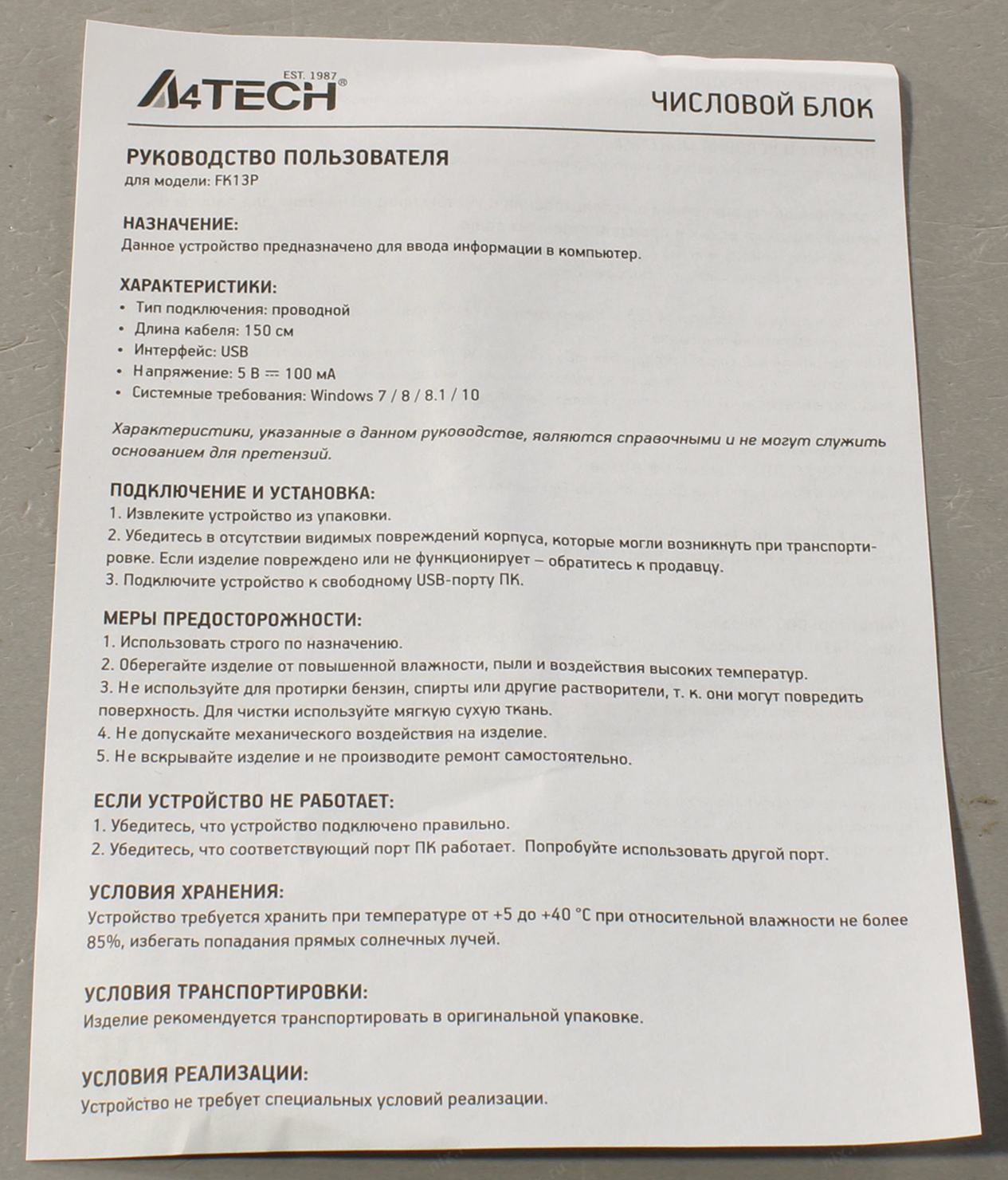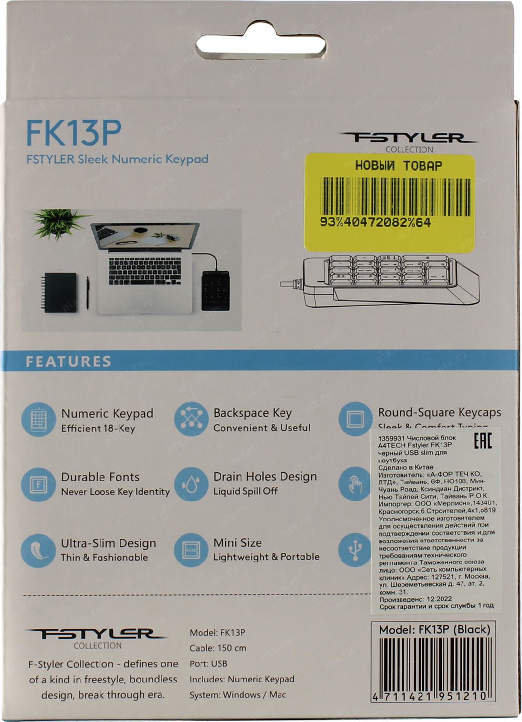 Числовой блок A4Tech FK13P черный USB slim для ноутбука (FK13P BLACK) кабель 1.5м