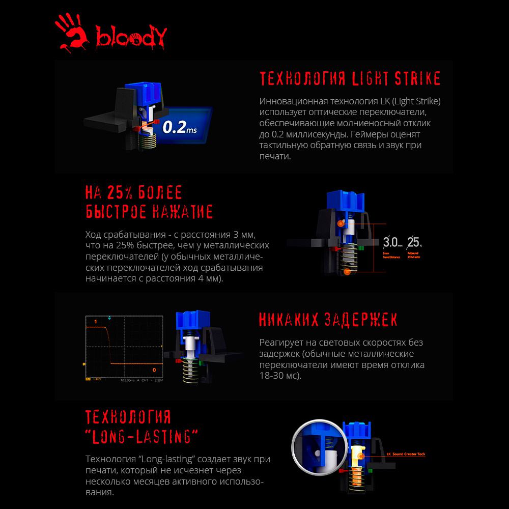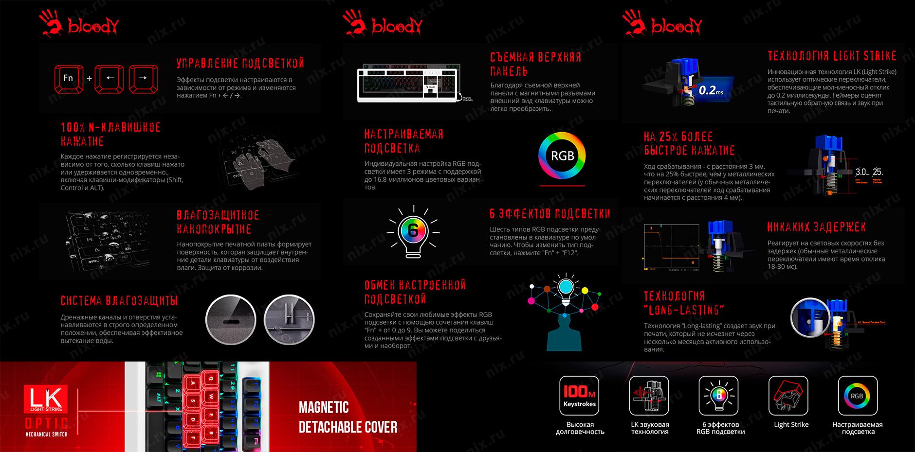 Игровая влагоустойчивая клавиатура с механическими клавишами и подсветкой символов. Используются оптические переключатели для уменьшения времени срабатывания.