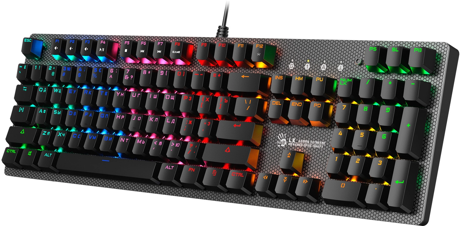 Игровая влагоустойчивая клавиатура с механическими клавишами и подсветкой символов. Используются оптические переключатели для уменьшения времени срабатывания.