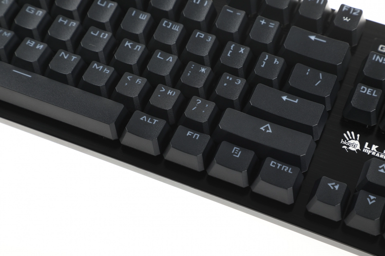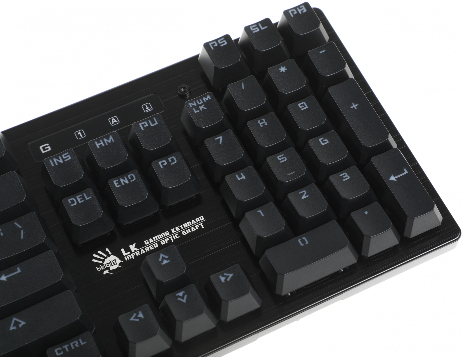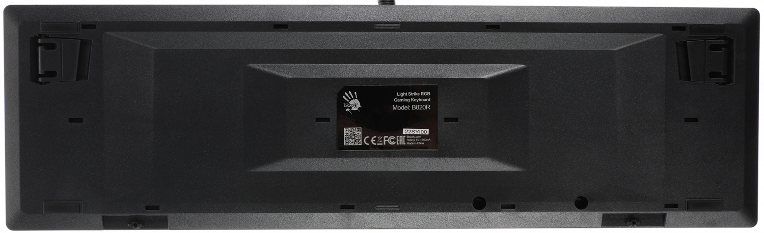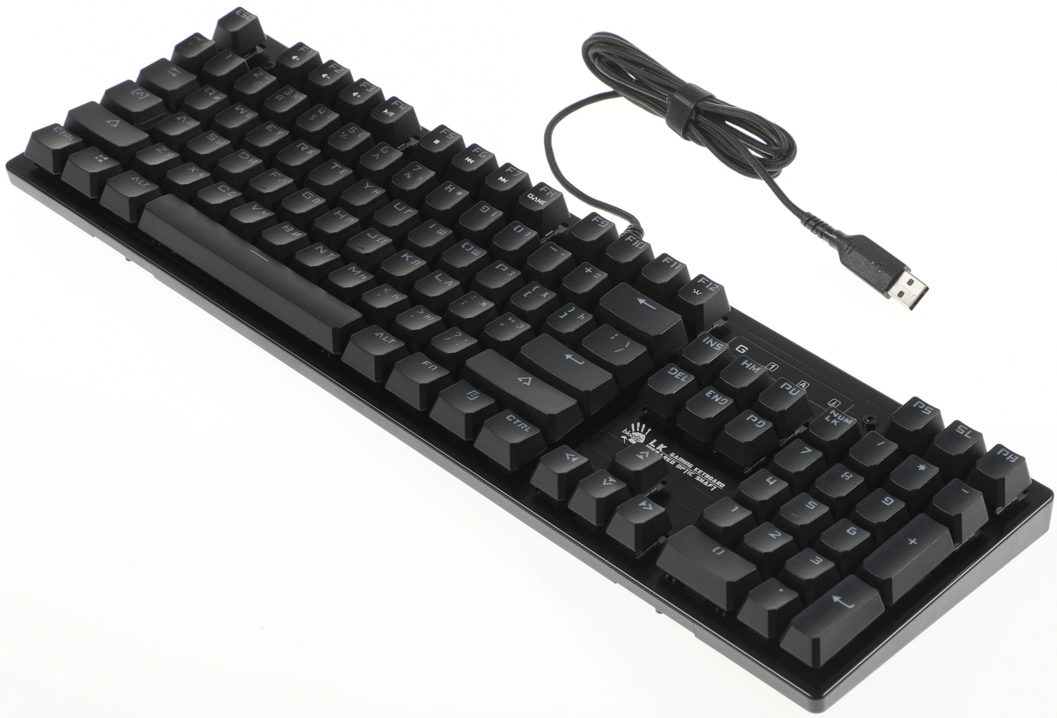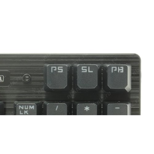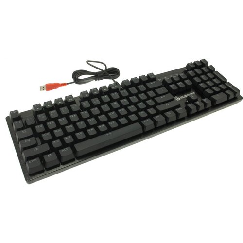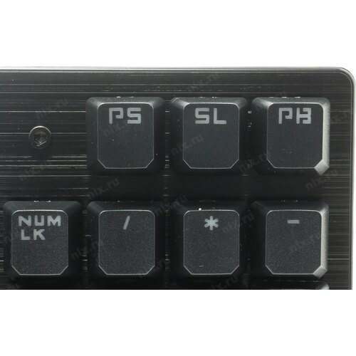 Игровая влагоустойчивая клавиатура с механическими клавишами и подсветкой символов. Используются оптические переключатели для уменьшения времени срабатывания.
