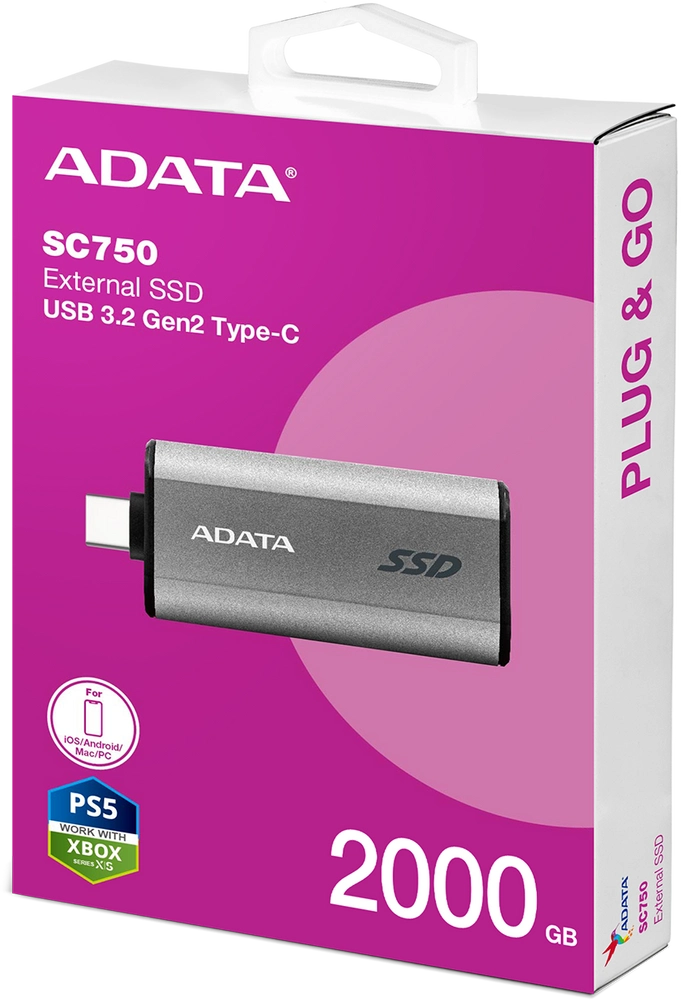 Носитель информации A-DATA Portable SSD 2TB A-DATA SC750, External, USB 3.2 Gen 2 Type-C, [R/W -1050/1000 MB/s] серый [SC750-2000G-CCBK]
