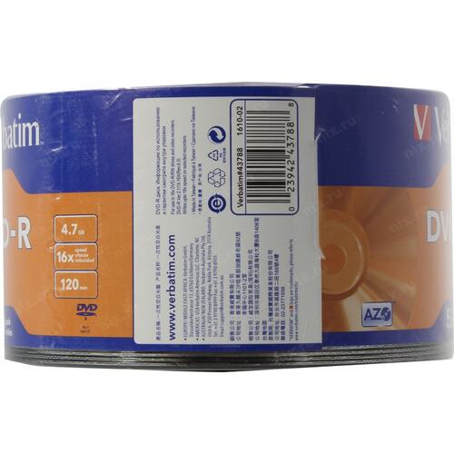 Диск Verbatim Диски DVD-R Verbatim 16-x 4.7Gb (50 шт)/Shrink/50 Azo (43788)