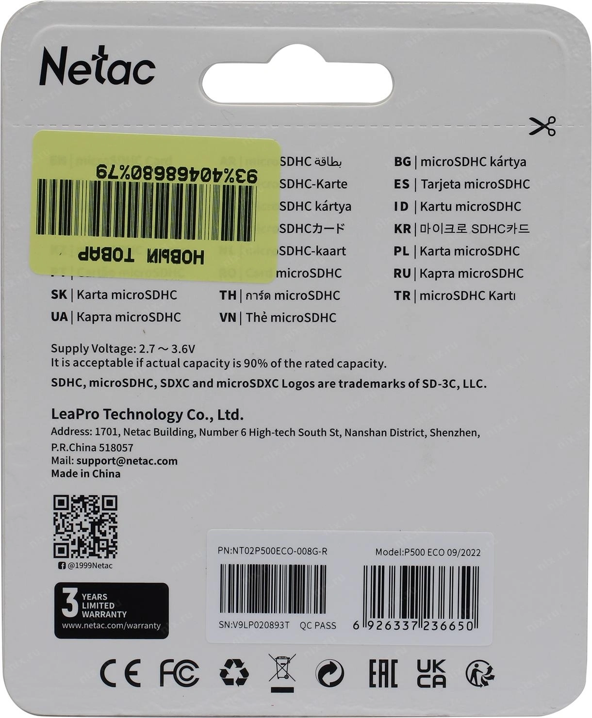 Носитель информации Netac P500 ECO 8GB MicroSDHC C10 up to 20MB/s, retail pack with SD Adapter <NT02P500ECO-008G-R>