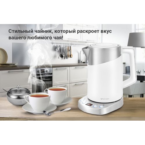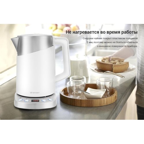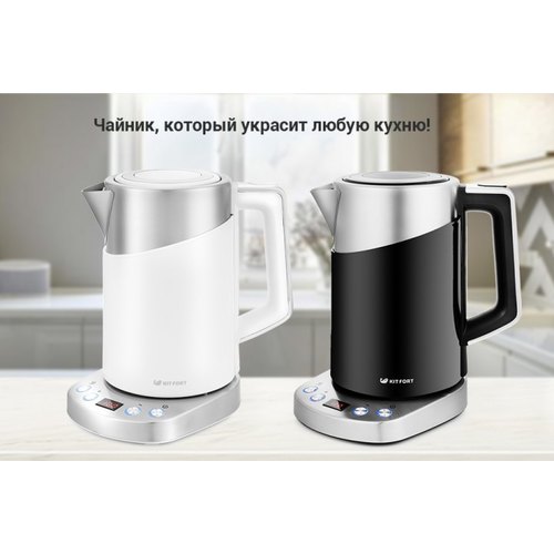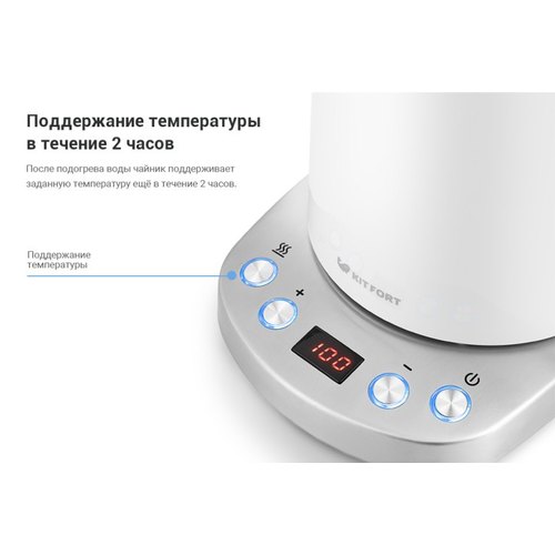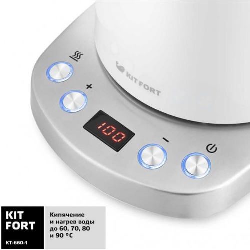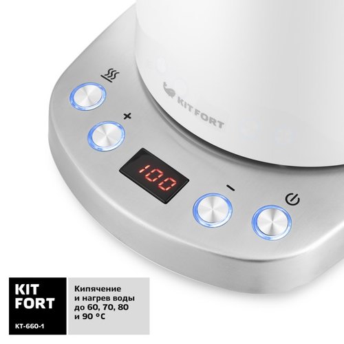 Электрический чайник с электронным терморегулятором Kitfort КТ-660 может не только вскипятить воду, но и нагреть ее до температуры 60, 70, 80, 90 и 100°С, что очень удобно при заваривании различных сортов чая. Чайник также оснащен функцией поддержания температуры.