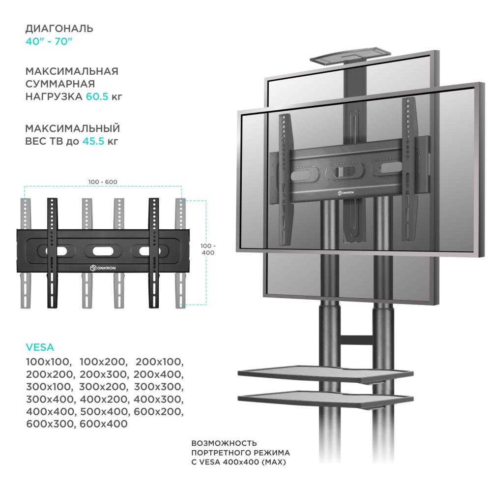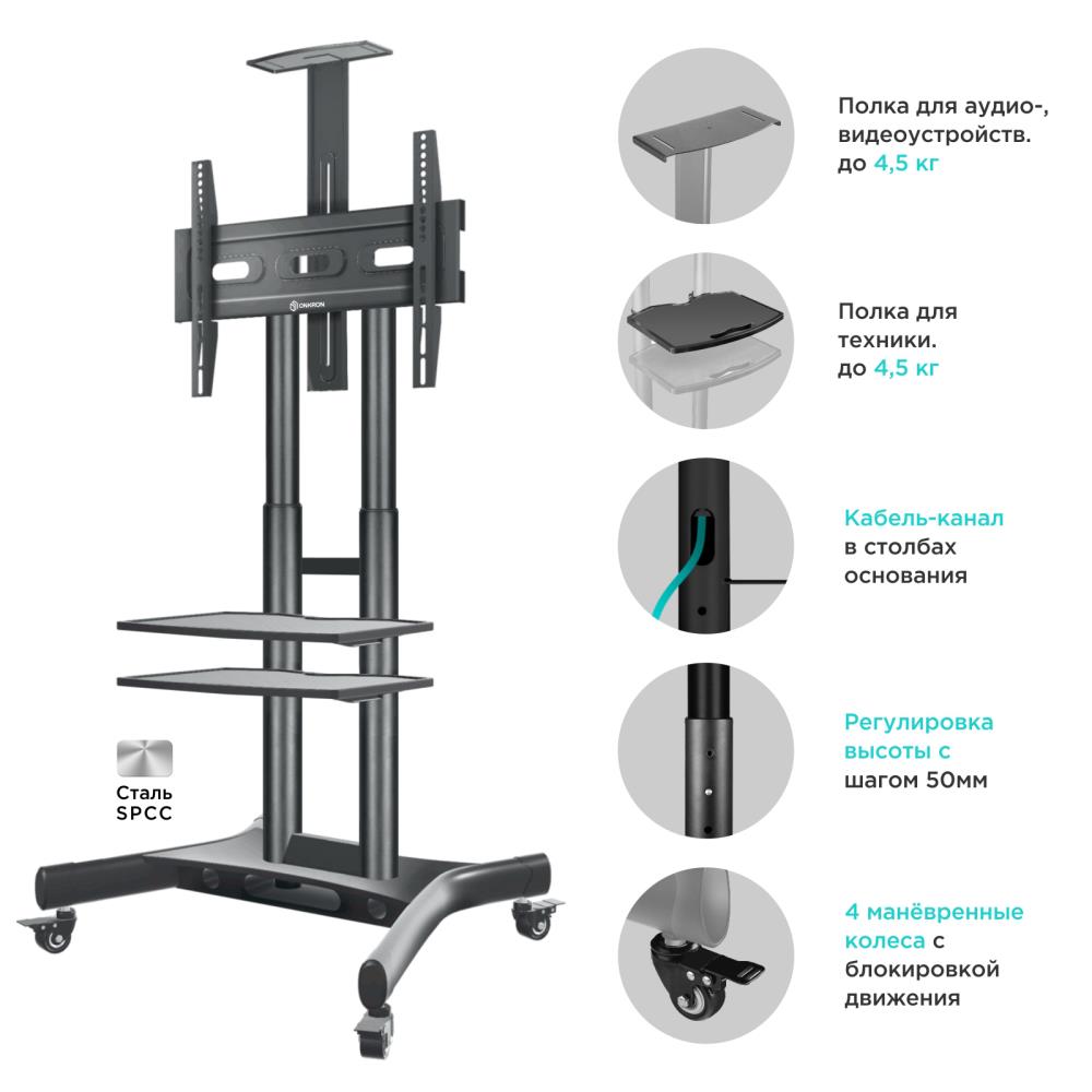 Подставка для телевизора Onkron TS1552 черный 40"-70" макс.60.5кг напольный мобильный