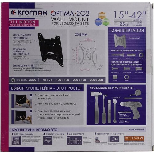 Крепеж Kromax OPTIMA-202 black (Кронштейн для LED/LCD телевизоров 15"-42", max 25 кг, настенный, 3 ст свободы, наклон +5°-12°, поворот ±30°, от стены 68.5 мм, max VESA 200x200 мм) [28006]