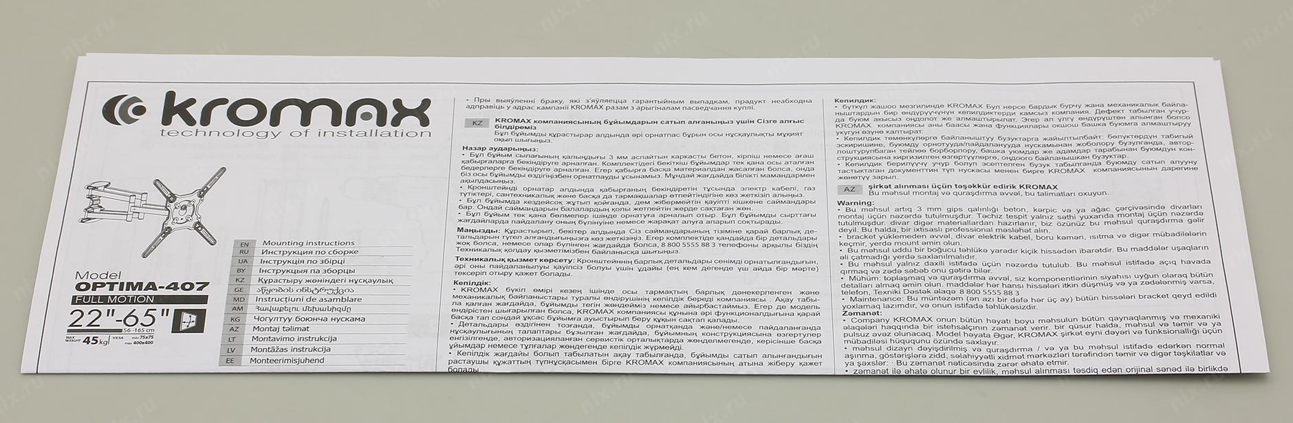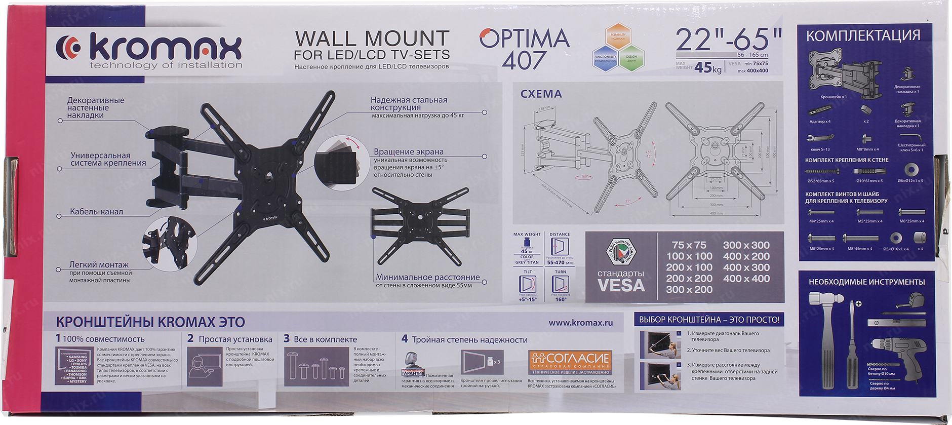 Крепеж Kromax OPTIMA-407 grey (Кронштейн для LED/LCD телевизоров 22"-65", max 45 кг, настенный, 5 ст свободы, наклон +5°-15°, поворот 180°, от стены 55-470 мм, max VESA 400x400 мм) [20242]