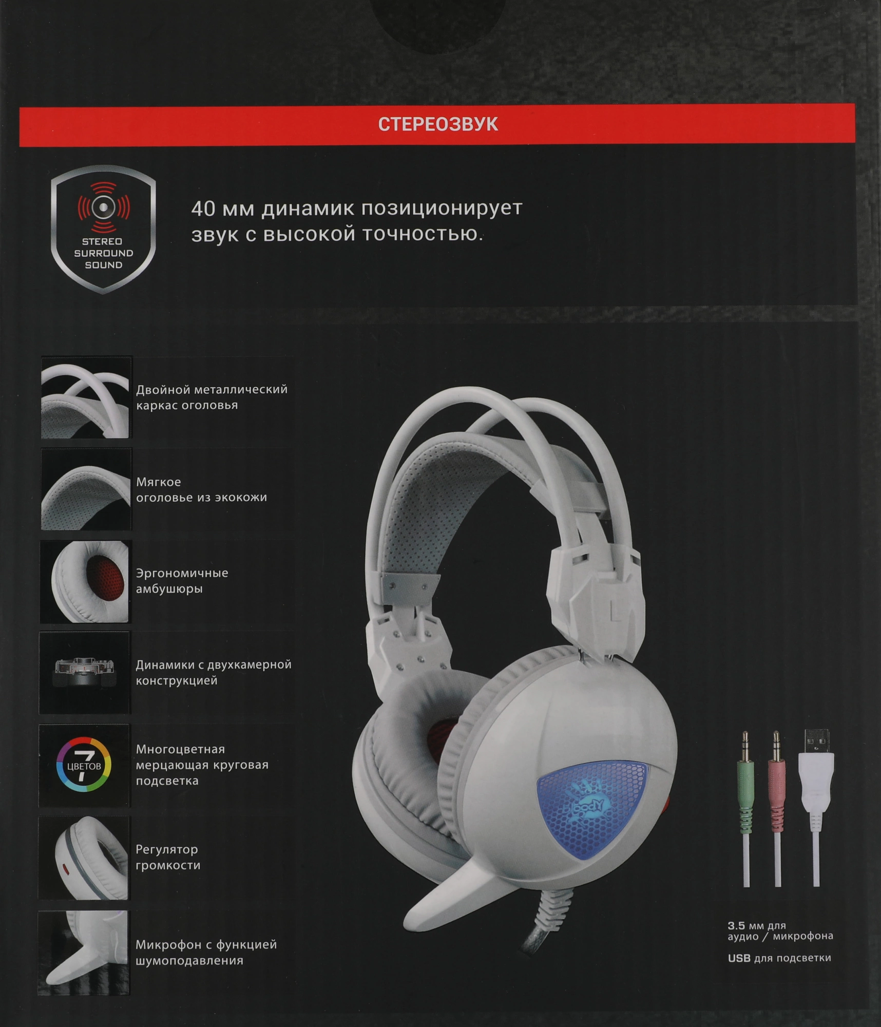 Игровая гарнитура с большими амбушюрами, самонатягивающимся кожаным оголовьем и микрофоном с шумоподавлением. Многоцветная подсветка корпуса (питание от USB).