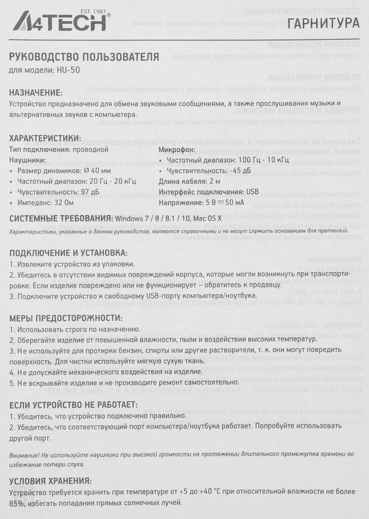 Наушники A4Tech A4 HU-50 черный 2м накладные USB оголовье