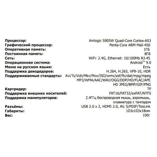 4K Ultra HD медиаплеер на базе операционной системы Android 9, с выходом HDMI 2.0, а также с настраиваемым универсальным пультом ДУ для одновременного управления телевизором и плеером. Надёжное подключение по WiFi доступно за счет встроенного адаптера и мощного программного обеспечения. Разъем HDMI 2.0 и универсальная платформа Android с возможностью загрузки всевозможных программных плееров, позволят воспроизвести любое 3D-видео или видеоролики в формате 4K Ultra HD при 60 Гц и 10-bit цвете. Плеер также поддерживает функции HDMI-CEC и HDR10