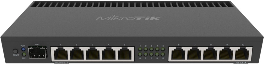 10 портов 10/100/1000 Мбит/сек, 1 из них PoE PD и 1 PoE PSE