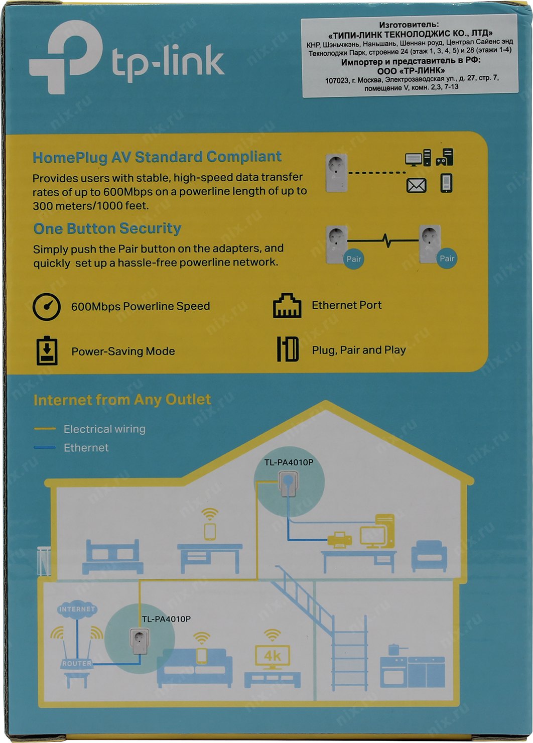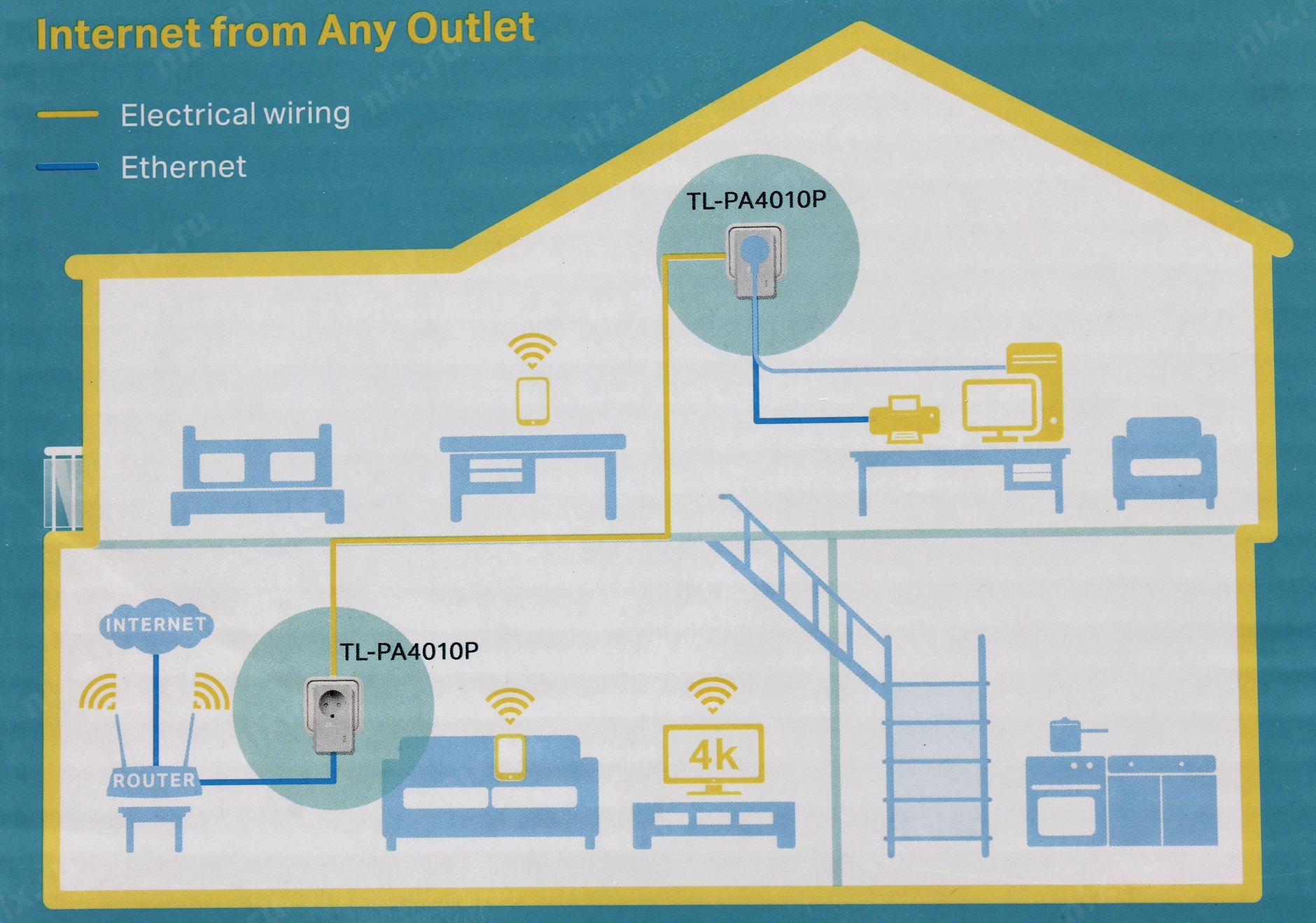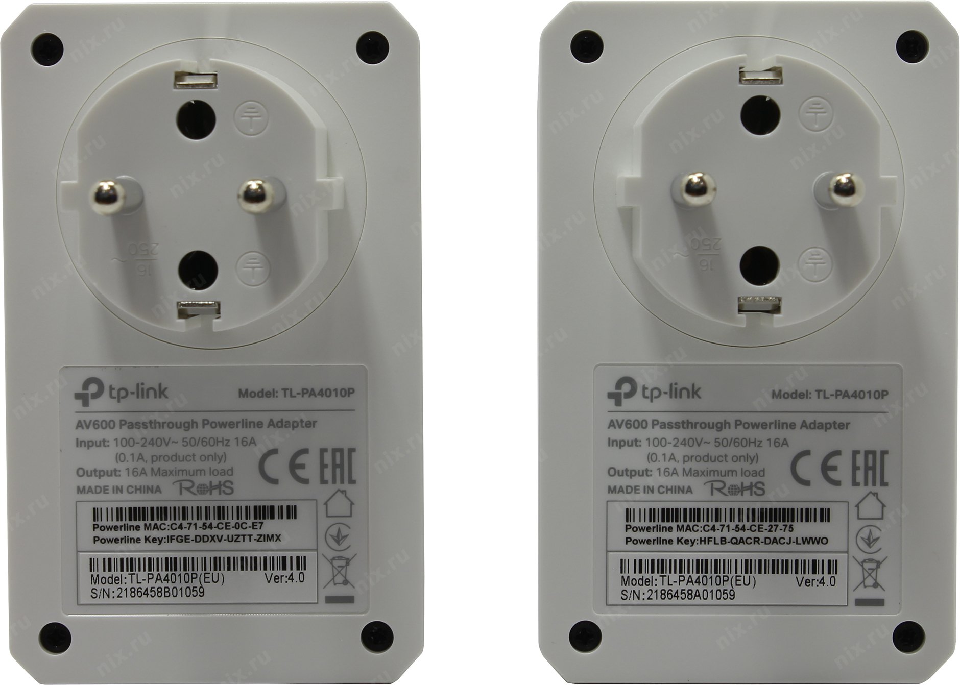 Комплект из 2-х адаптеров Powerline AV 500 Мбит/с (модель TL-PA4010P) с проходной розеткой. Возможно использование до 16 устройств в цепи.