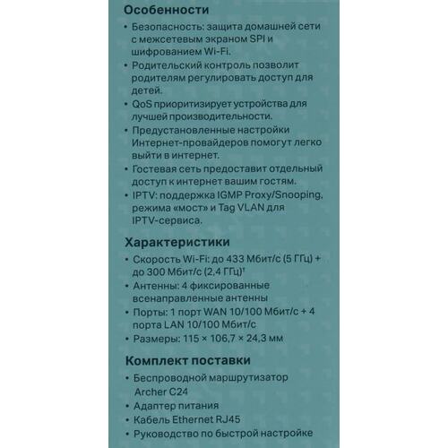 Сетевое оборудование TP-Link Archer C24 Двухдиапазонный роутер Wi-Fi AC750 [ArcherC24]