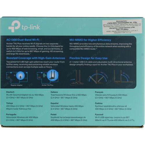 Сетевое оборудование TP-Link Archer T4U Plus AC1300 Wi-Fi USB-адаптер с двумя антеннами высокого усиления [ArcherT4UPlus]