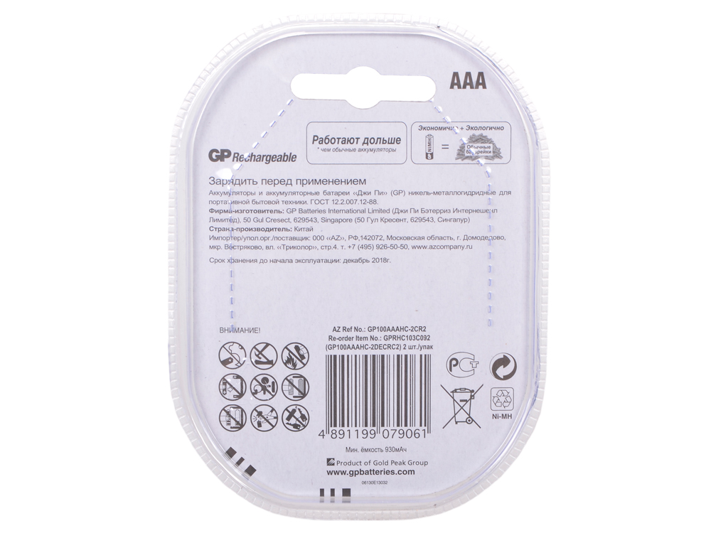 Аккумулятор GP ReEnergy 100AAAHC AAA, емкос1000 мАч (100AAAHCRGY-2CRCB2)(2 шт. в уп-ке) аккумулятор [4891199201448] [100AAAHC-2DECRC2]