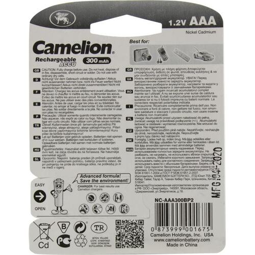 Аккумулятор Camelion AAA- 300mAh Ni-Cd BL-2 (NC-AAA300BP2, аккумулятор,1.2В) (2 шт. в уп-ке) [3144]