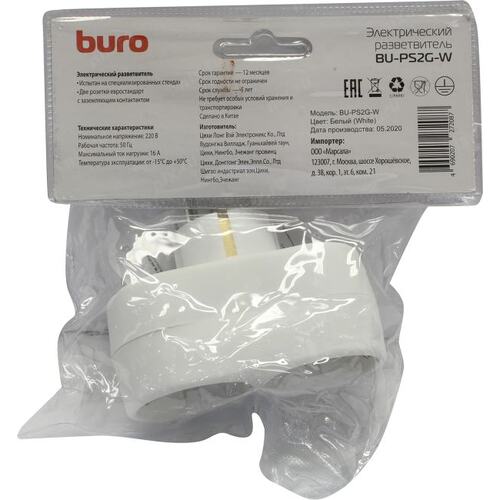 Сетевой разветвитель Buro BU-PS2G-W (2 розетки) белый (пакет ПЭ) (продается кратно 10 шт.)