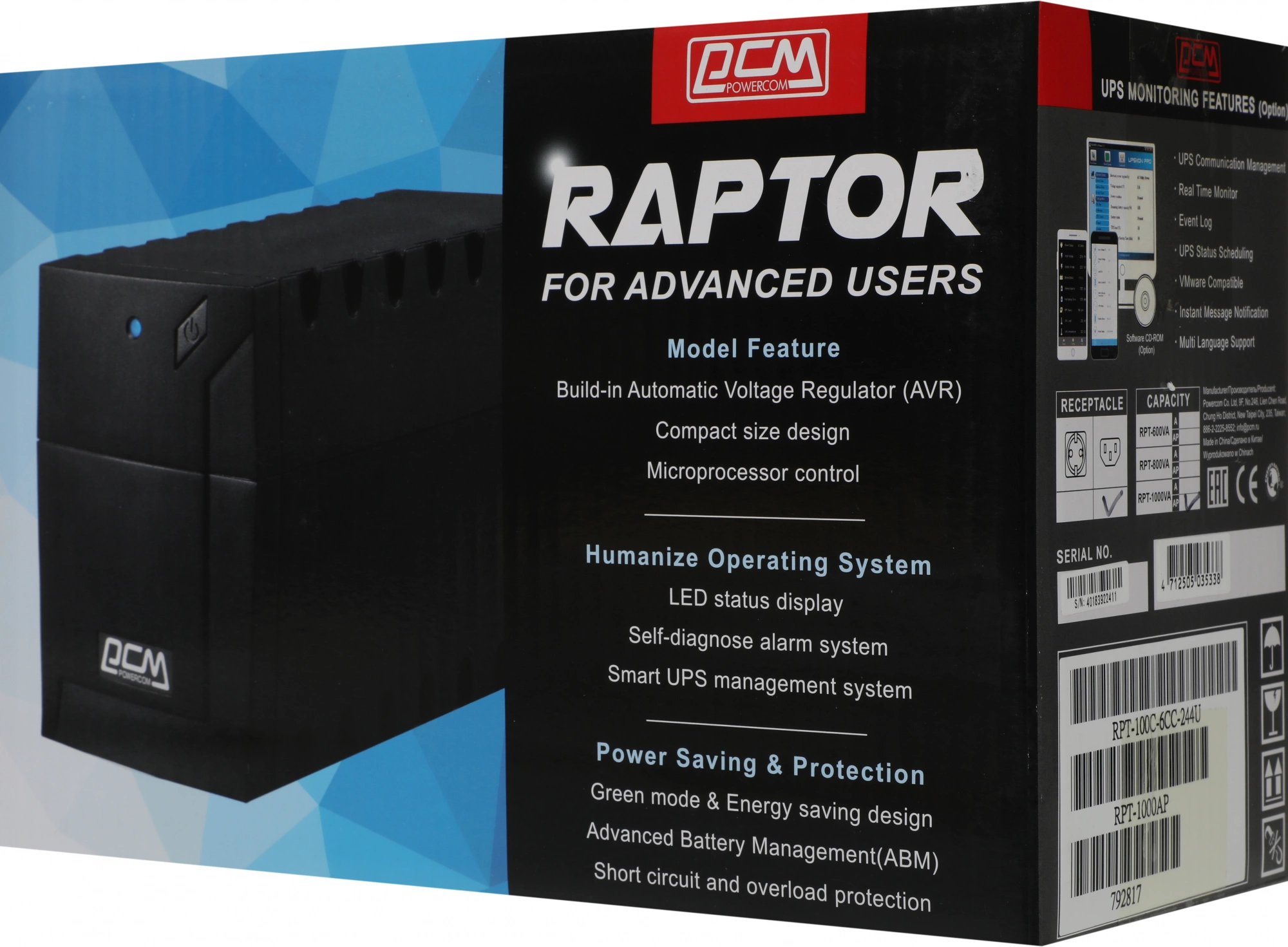 ИБП PowerCom Raptor RPT-1000AP ИБП (1000 ВА/ 600 Вт, AVR, USB, RJ11/RJ45, 3 xC13 с резервным питанием) (792817)