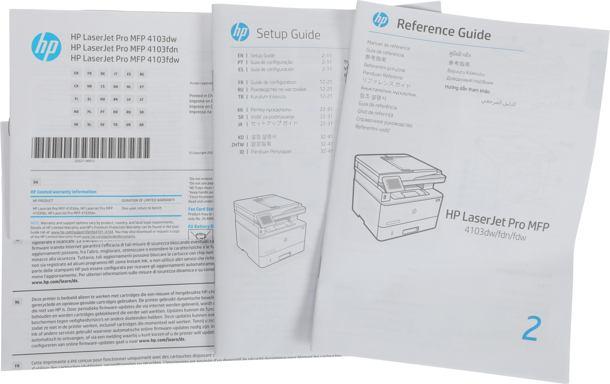 2Z629A МФУ HP LaserJet Pro 4103fdw стартовый картридж черный (3050 страниц); руководство по началу работы; листовка с нормативными требованиями; кабель питания; кабель USB