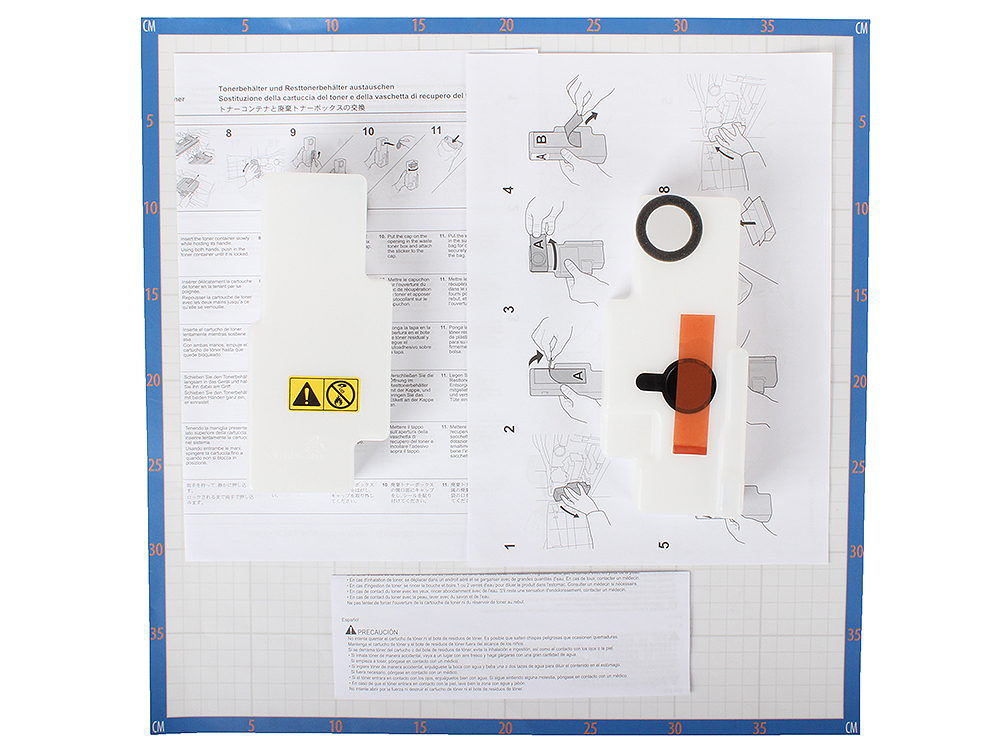 Контейнер с тонером TK-715, бункер для отработанного тонера, салфетка для сбора просыпавшегося тонера, инструкция по замене картриджа и бункера отработанного тонера