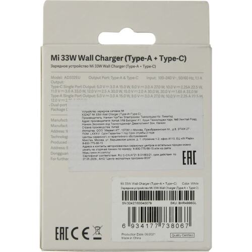 Сетевое зар./устр. Xiaomi Mi 33w Wall Charger 33W 3A (PD) USB-C/USB-A универсальное белый (BHR4996GL)