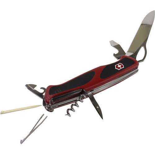 Лезвие с системами блокировки и открывания одной рукой, открывалка для консервных банок, малой отверткой 3 мм, открывалка для бутылок с плоской отвёрткой с системой блокировки и приспособлением для зачистки проводов, пила по дереву, шило, штопор, пинцет, зубочистка, кольцо для ключей