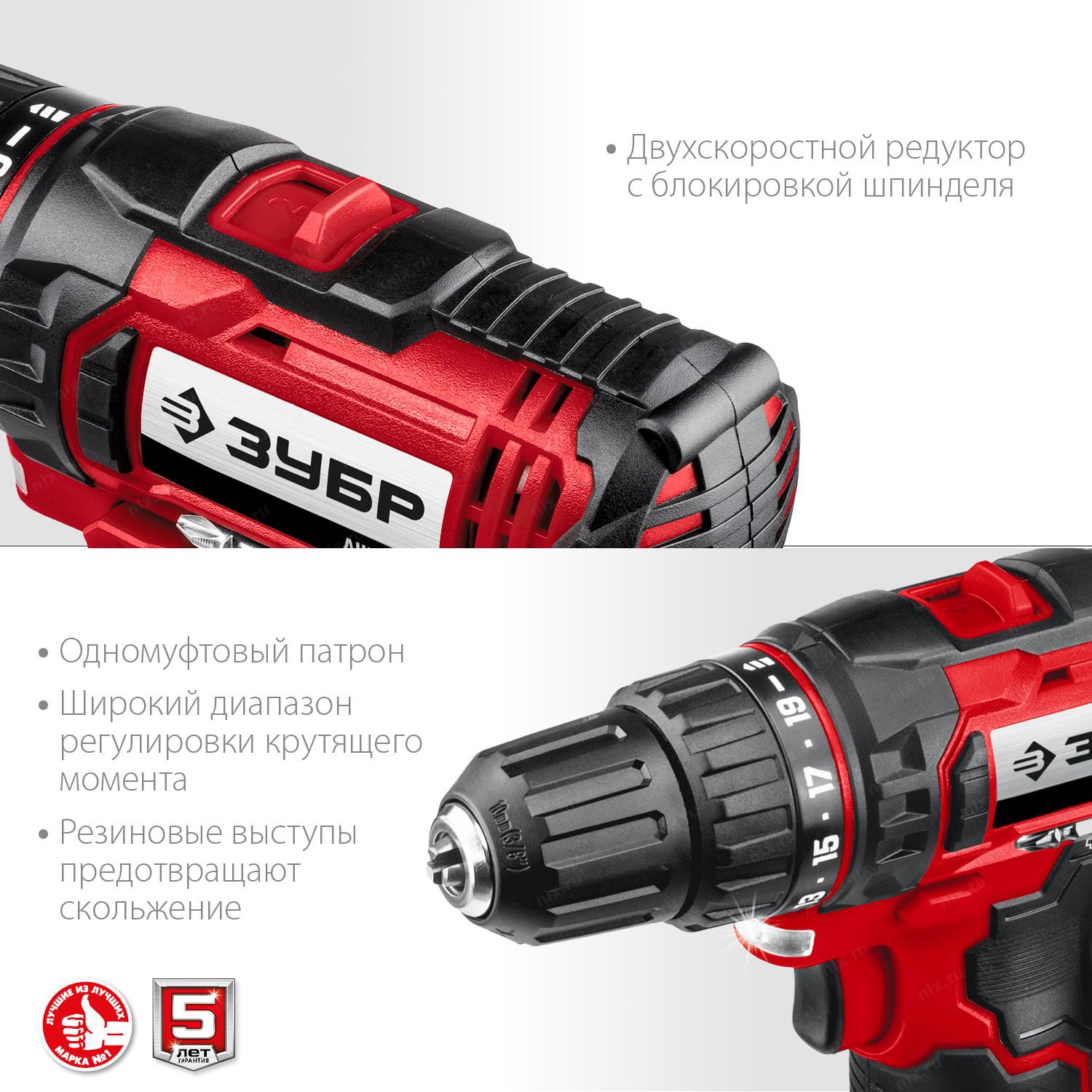 Легкий и производительный инструмент с широким спектром применения ;;Компактный аккумуляторный шуруповерт с удобной эргономикой для комфортной работы ;;Высокий крутящий момент при широком диапазоне оборотов благодаря конструкции редуктора ;;Литий-ионная технология ЗУБР нового поколения: ;;- увеличение производительности на 35%,;;- электронная система защиты от перегрузки, перегрева и глубокой разрядки,;;- отсутствие эффекта памяти,;;- отсутствие потери мощности в процессе работы ;;Бесключевой одномуфтовый патрон для максимальной простоты и скорости замены расходного инструмента ;;Двухскоростной планетарный редуктор позволяет как заворачивать с большим крутящим моментом, так и сверлить на высоких оборотах ;;Широкий диапазон регулировки крутящего момента превращает изделие в универсальный инструмент: от аккуратного закручивания маленьких винтиков до заворачивания крупных саморезов ;;Многофункциональный выключатель с электроникой обеспечивает: ;;- контроль и защиту батареи от глубокого разряда, перегрузки и перегрева (не требует дополнительной микросхемы в батарее),: ;;- управление всеми режимами работы двигателя (старт, регулировка скорости, торможение, реверс),: ;;- управление подсветкой ;;Электронный тормоз двигателя для исключения выбега при остановке ;;Быстрозарядное интеллектуальное устройство с импульсной подачей тока для бережной и полной зарядки аккумулятора ;;Встроенный в корпус магнитный держатель для бит позволяет всегда иметь их под рукой ;;Подсветка рабочего места способствует дополнительному удобству при работе в условиях недостаточного освещения ;;Реверс ;;Рукоятка с противоскользящей накладкой
